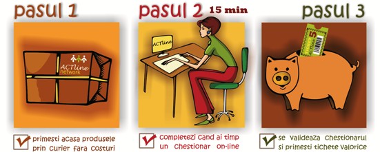 Ori de cate ori organizam o activitate ACTline, va vom trimite pe email o invitatie de participare care va contine detalii despre natura activitatii, timpul estimat alocat si cuantumul recompensei primite. Aveti libertatea de a accepta sau refuza invitatia dupa dorinta dvs. Activitatea consta in completarea unui scurt chestionar pe care il accesati urmand linkul trimis de noi pe email. Singura conditie este sa va exprimati deschis si sincer opinia dvs. referitoare la diferite produse sau servicii. Daca acceptati invitatia noastra si finalizati activitatea propusa, veti primi de fiecare data ca recompensa tichete valorice ACTline5. Programul nostru de recompensare, ca venit suplimentar, este cunoscut ca fiind unul dintre cele mai bune din domeniu.